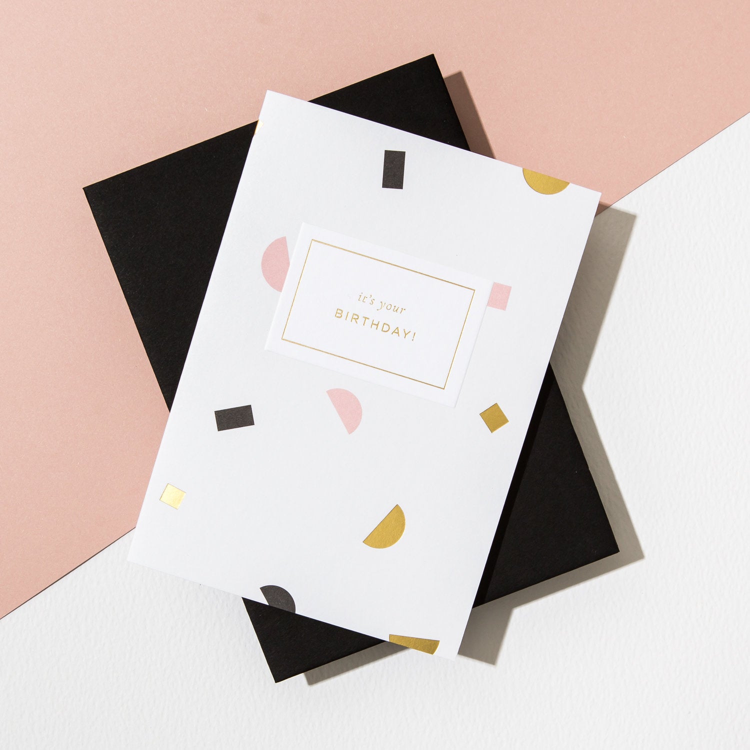 The A L'Aise card is foil printed in London with the words 'Happy Birthday' on the front. It is paired with a luxurious black coloured envelope.
