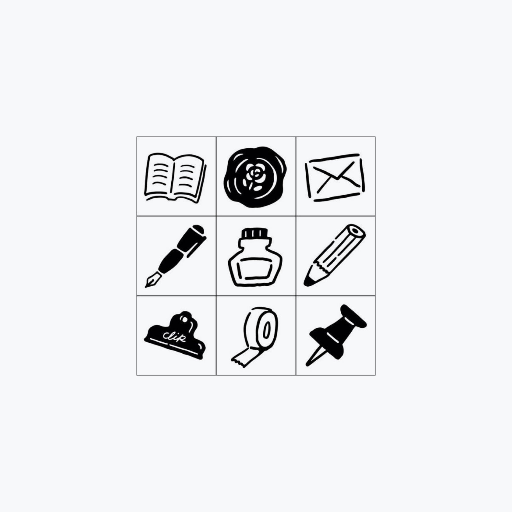 The Beverly mini-size, rubber stamps are perfect for decorating your planner or journal. The set includes nine stationery themed stamps in a protective hard plastic case. Each stamp creates an impression approximately 8mm x 8mm.