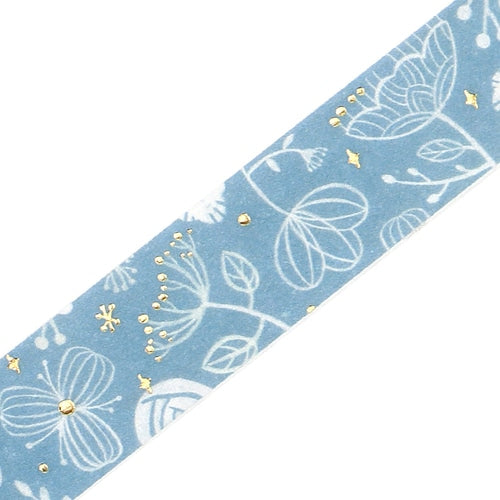 Elegant white floral outlines with delicate gold accents on a blue background - simple, and refined decorative washi tape.