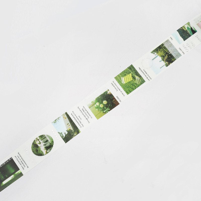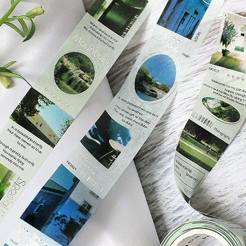 A photo-collage-style washi tape with urban scenes in calming green tones.