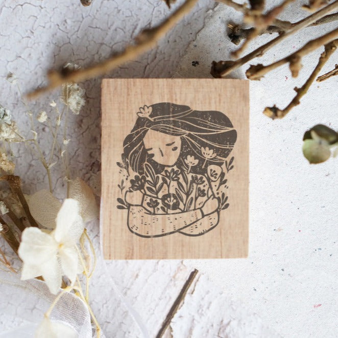 A wooden stamp with a gentle illustration of a girl embracing an armful of flowers—soft, heartfelt, and full of warmth.