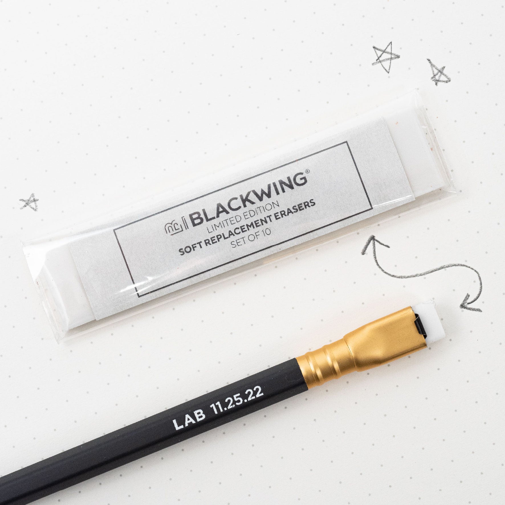 Lab 11.25.22 is the sixth instalment of the Labs series. With this Lab, Blackwing experimented with a soft eraser that is made using the same material as the Handheld Eraser. Each pencil features a matte grey barrel, white imprint, balanced graphite, a new matte gold ferrule and a white “soft” eraser.