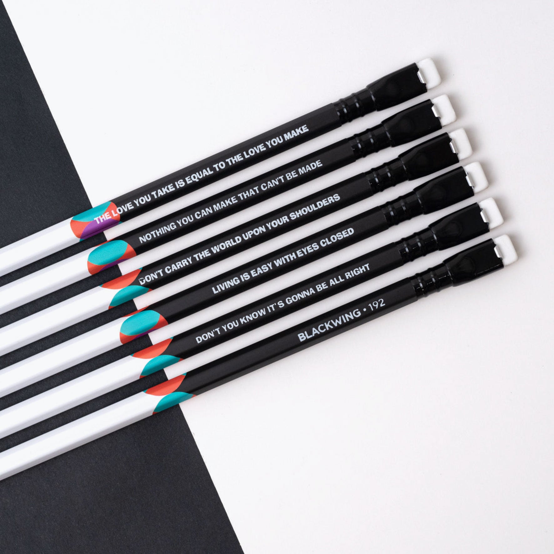 The Blackwing Volume 192 is a tribute to John Lennon and Paul McCartney and the estimated 192 songs they wrote together. The colour prism design depicts the convergence of two powerful creative forces. A different Lennon-McCartney lyric is foil stamped on each pencil, for a total of twelve different lyrics in the set.