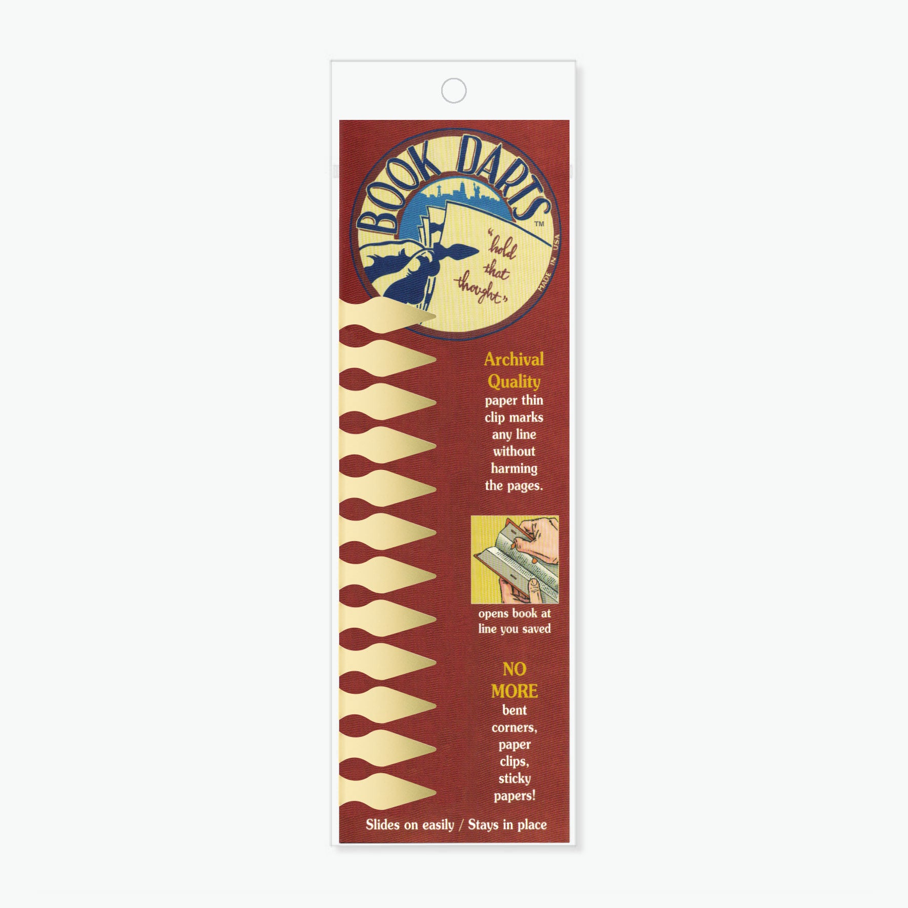 Book Darts are precision-cut, paper-thin metal line markers that slide easily on and off any page without damaging it. This sleeve contains 12 brass book darts that can be reused over and over.