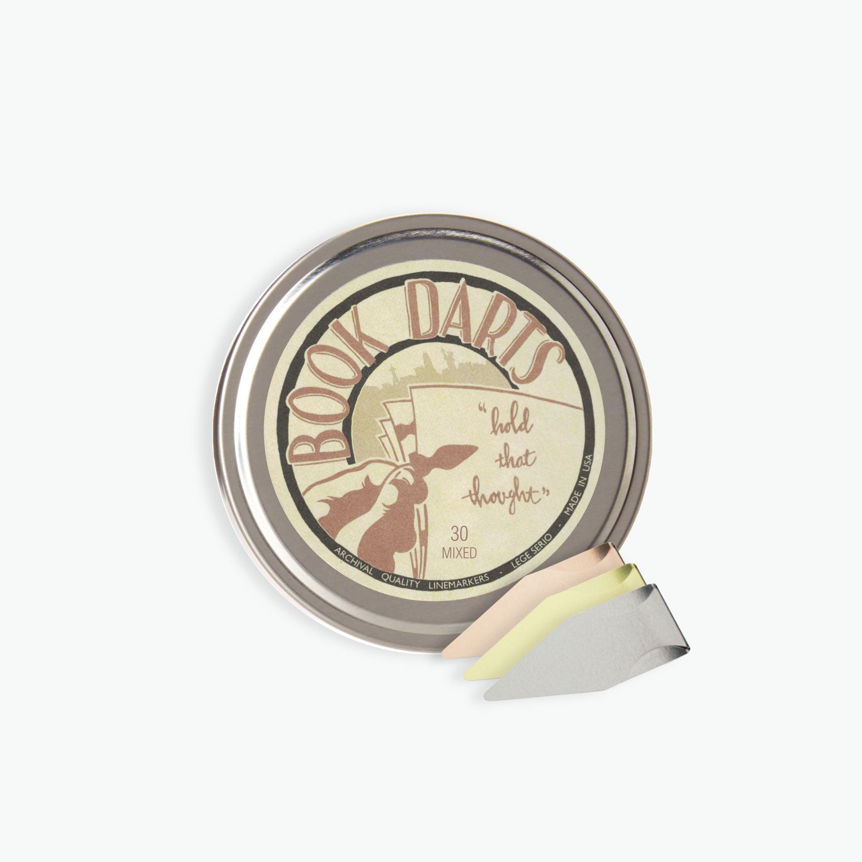 Book Darts are precision-cut, paper-thin metal line markers that slide easily on and off any page without damaging it. This decorative silver tin contains 30 mixed (bronze, brass, silver) book darts that can be reused over and over.