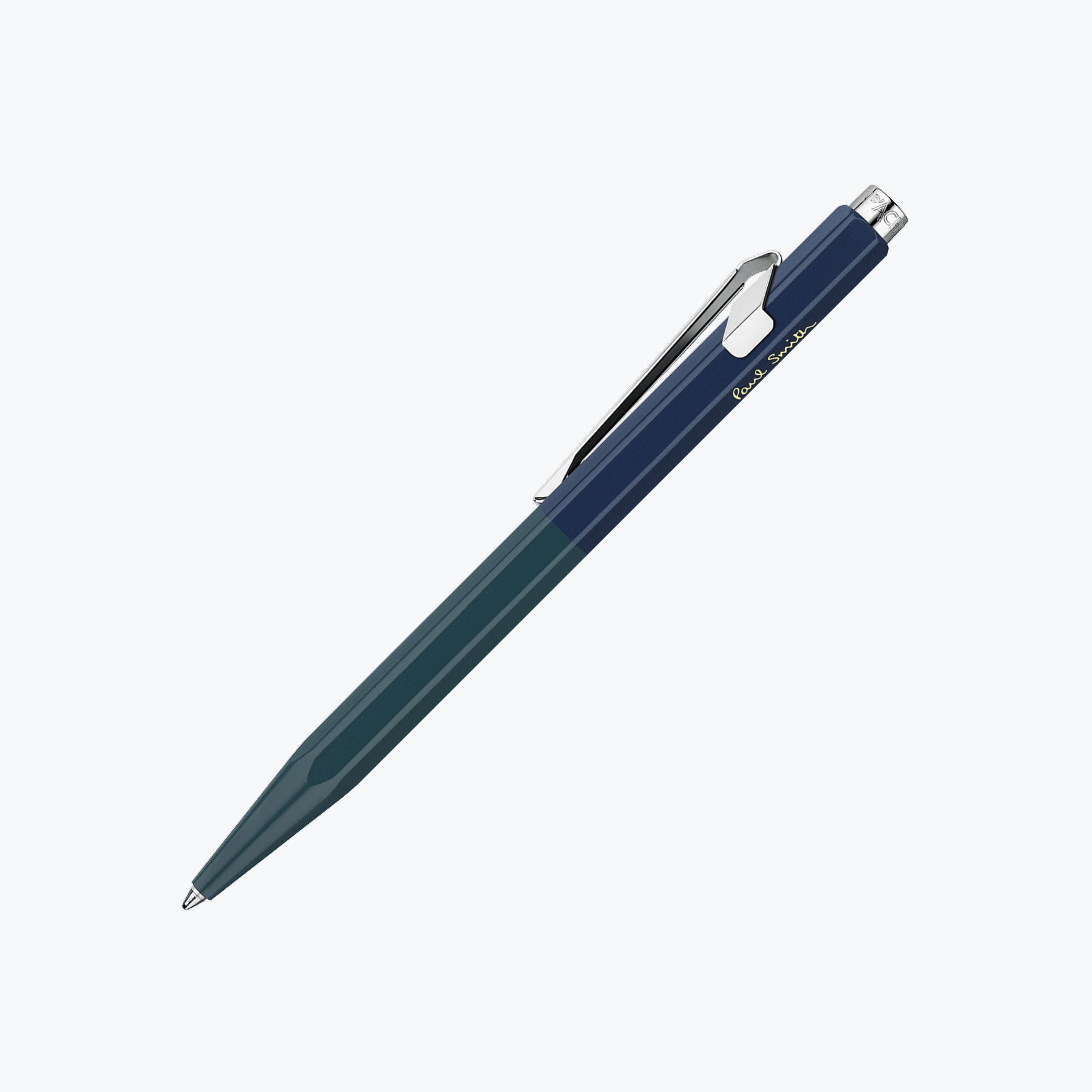 Made in Switzerland with a strong aluminium hexagonal body and a flexible clip, the pen is finished with a Paul Smith signature on the body. The packaging of the Racing Green & Navy Blue 849 matches the colour split of the pen.