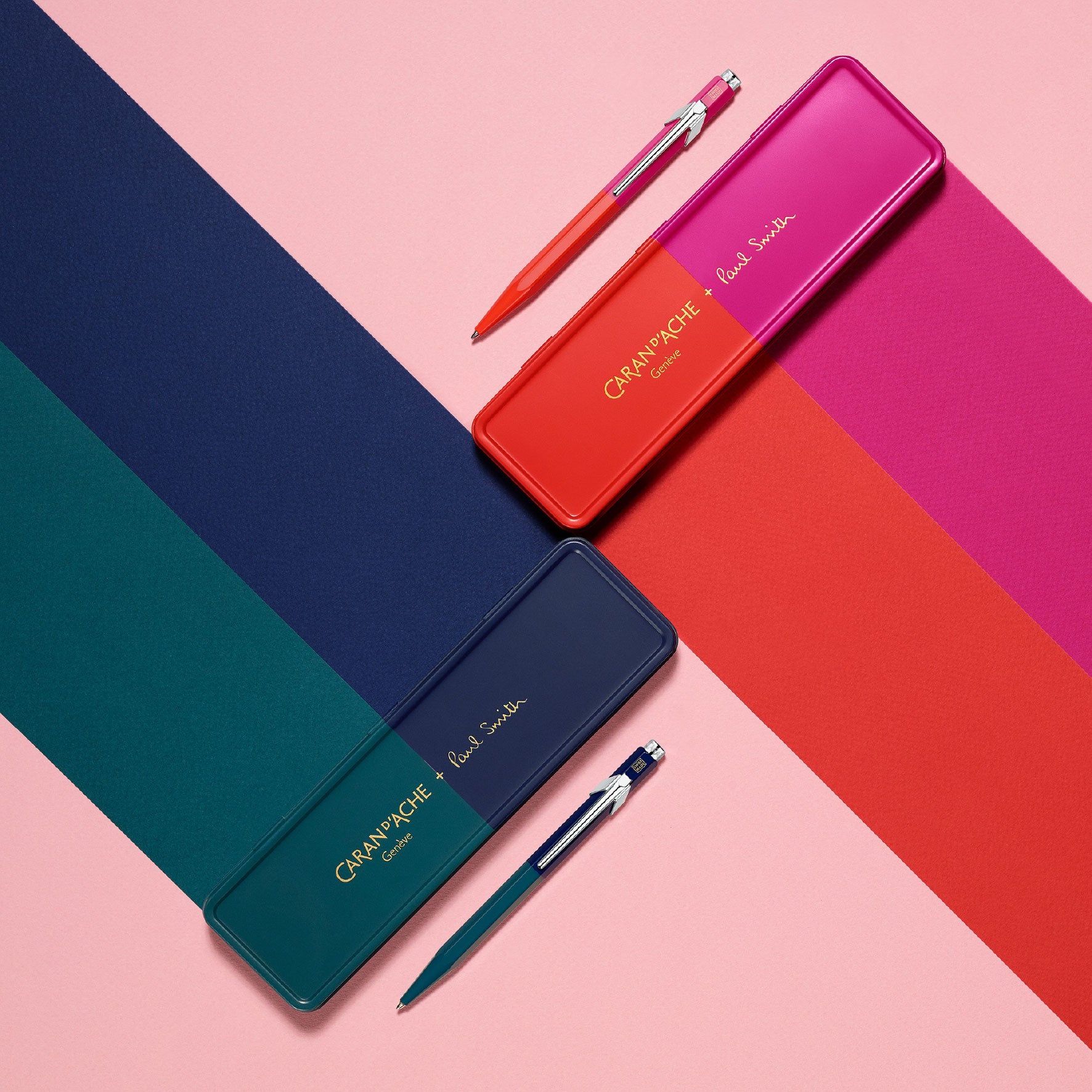 In this latest chapter in the ongoing partnership, Paul Smith has transformed his everyday top pocket companion - the Caran d'Ache 849 ballpoint pen - with a dual split colour exterior. The result is a playful twist on a classic design.