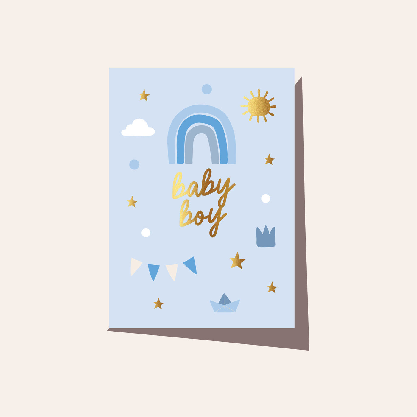 Celebrate a new arrival with this sweet baby boy card featuring a soft rainbow motif in gold foil.