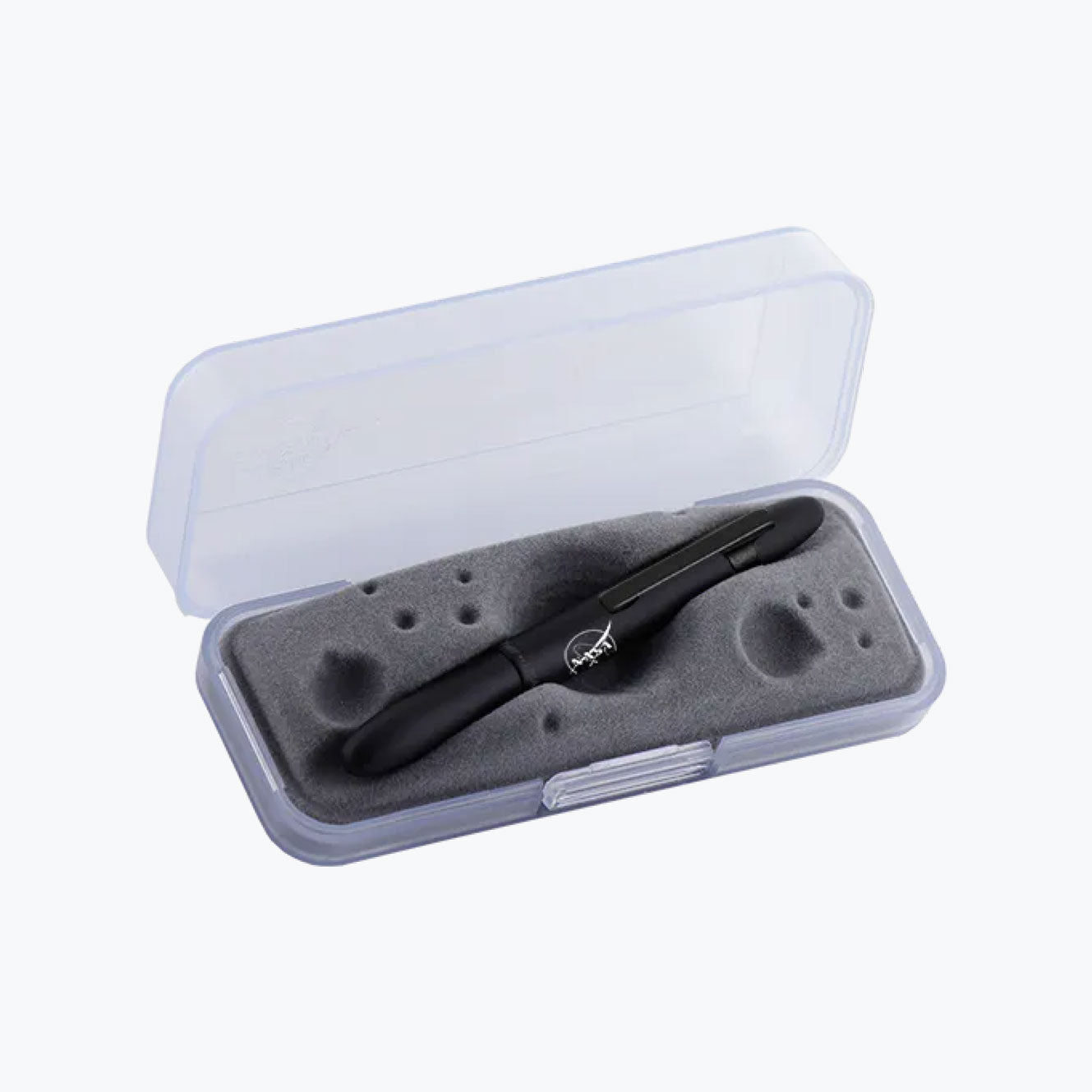 The body of the pen is all brass with a matte black finish and NASA logo and includes a matching clip. When closed, the Space Pen is the perfect size to carry and when open, it is a full sized, evenly balanced writing instrument. The Space Pen is made in the USA where it is precision assembled and hand tested so it is no surprise that it carries a lifetime promise against all manufacturing defects. It comes in a Moonscape Gift Box with Astronaut Sleeve and includes a black, medium ink cartridge, which can be purchased separately here.