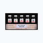 The autumn set features warm orange, red and brown colours - Terre de Feu, Ambre de Birmaine, Rouge Grenat, Orange Indien and Lie de The. Each bottle contains 10ml of ink so it is the perfect sample pack.