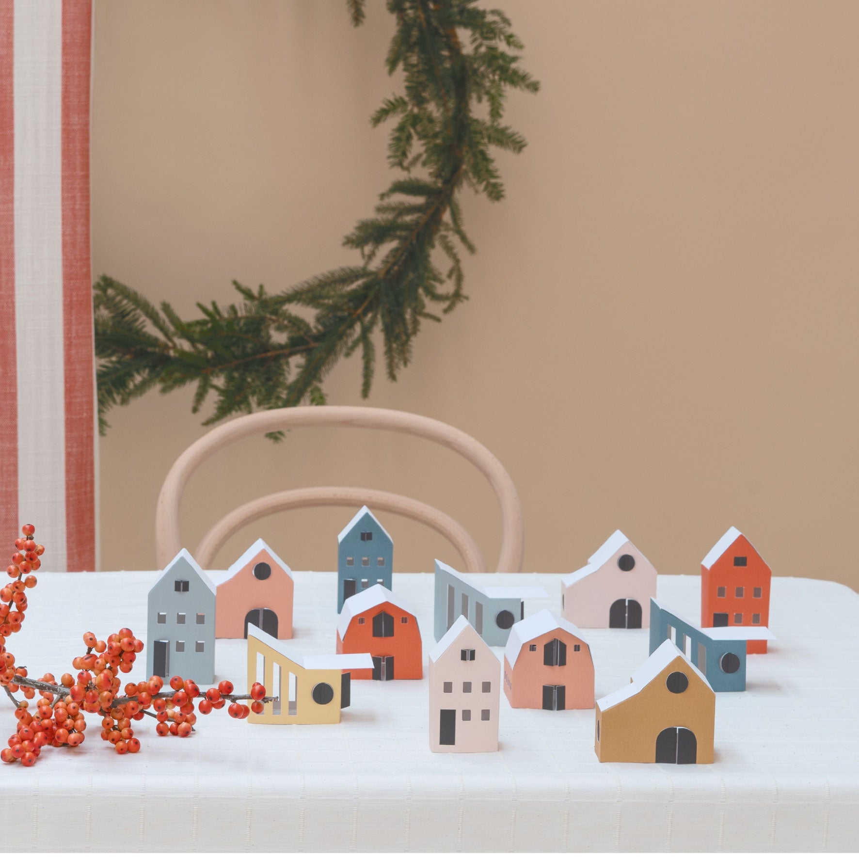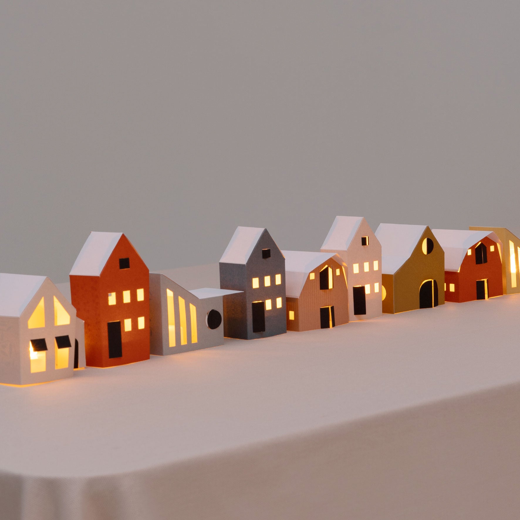 Once finished, the houses can be used as decorations on a fireplace or table, place settings or gift tags or a garland on a window or wall. They can even be used to make an Advent calendar by filling them with messages or small gifts.