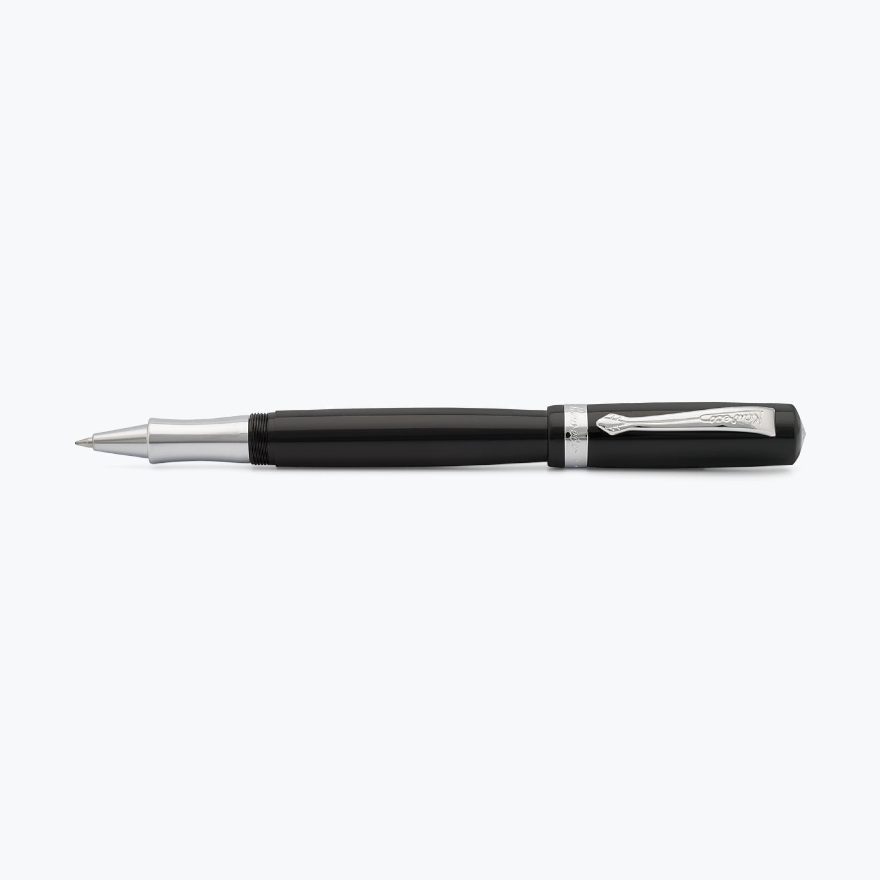 The Kaweco Student cap and body are made from a high-quality black resin, with silver-tone chrome trim, finial, and grip section. The rollerball pen features a screw-on cap and metal clip, with Kaweco engraved on the clip and trim and the logo on the top of the cap.