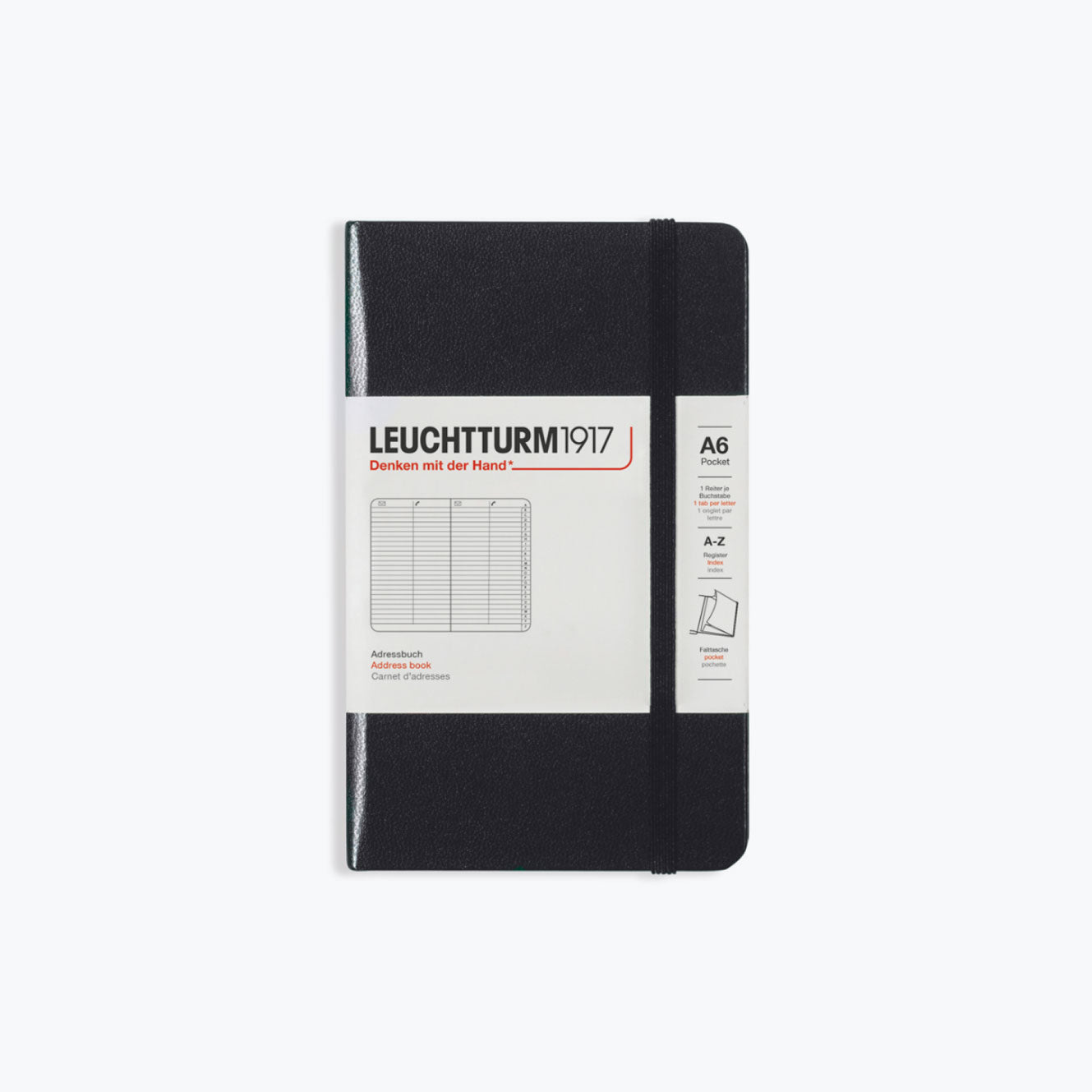 The famous Lauchtturm1917 address book features 104 pages of A-Z tabs (1 tab per letter, 4 pages per letter). The Leuchtturm1917 address book is thread-bound so it remains flat when open, while an elastic band holds it closed when not in use. It comes with a blank table of contents, stickers for labelling and archiving, a gusseted pocket on the back cover and a page marker.