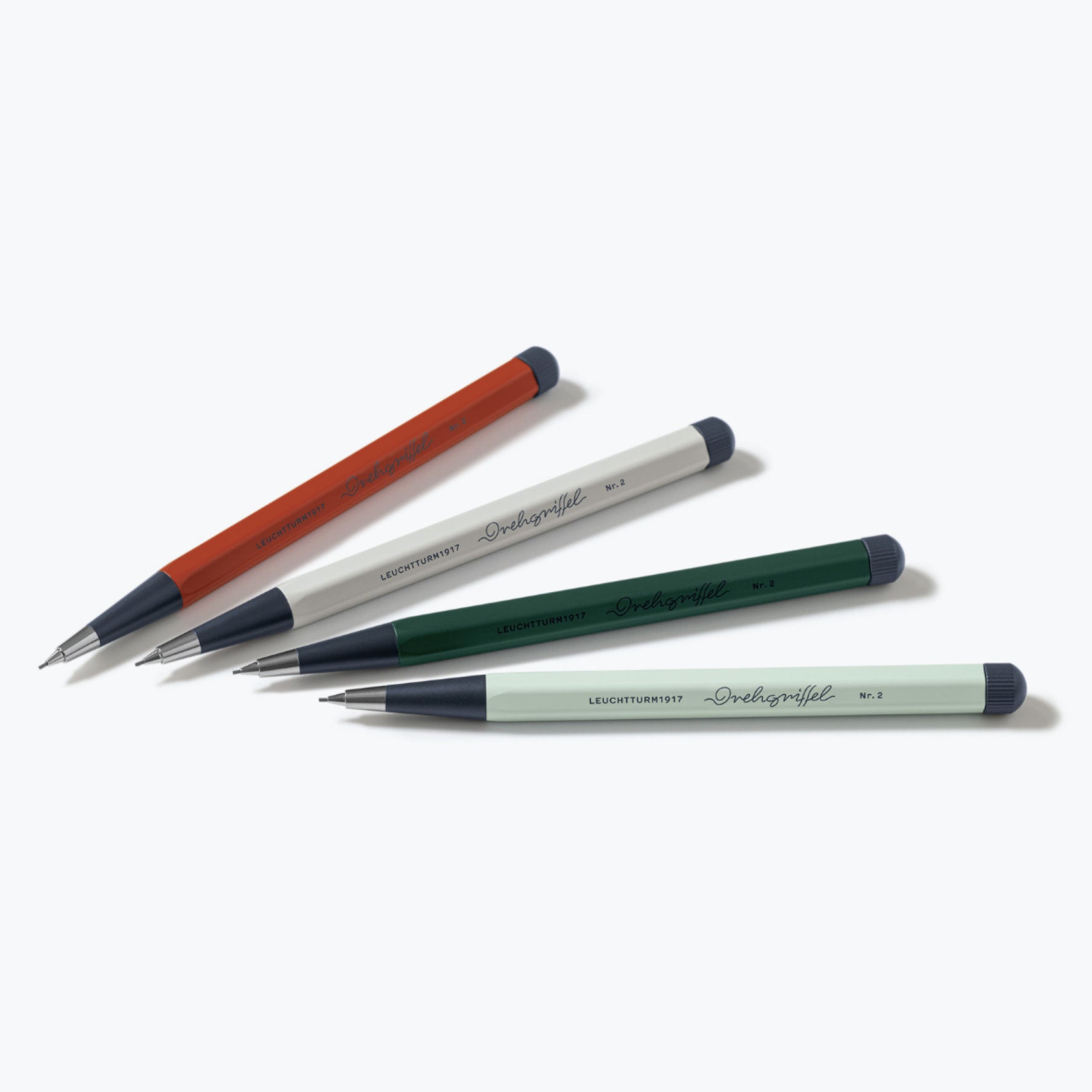 The Drehgriffel Nr. 2 by Leuchtturm1917 is a mechanical pencil with a German-made twist mechanism: press to release the lead, release to lock it in place. The internal chamber holds several 0.7 mm HB graphite leads and feeds them automatically. Secure grip and anti-roll shape.