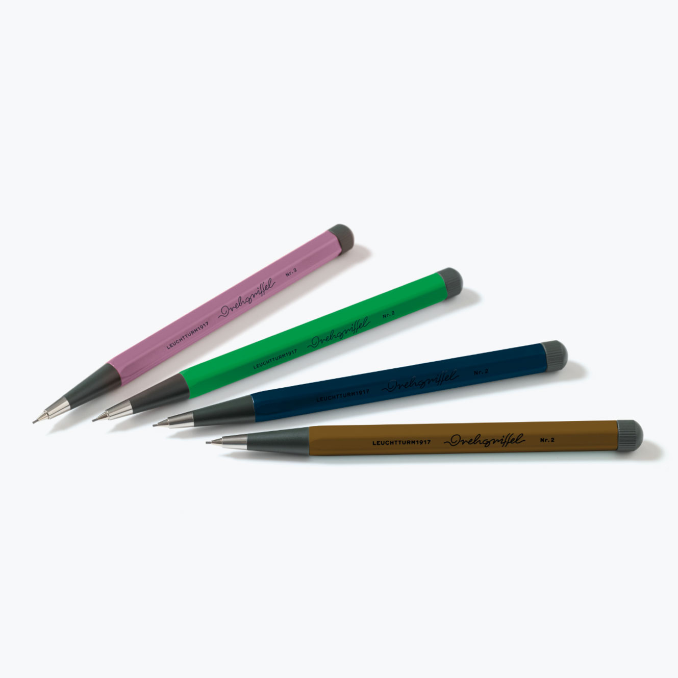 The Drehgriffel Nr. 2 by Leuchtturm1917 is a mechanical pencil with a German-made twist mechanism: press to release the lead, release to lock it in place. The internal chamber holds several 0.7 mm HB graphite leads and feeds them automatically. Secure grip and anti-roll shape.