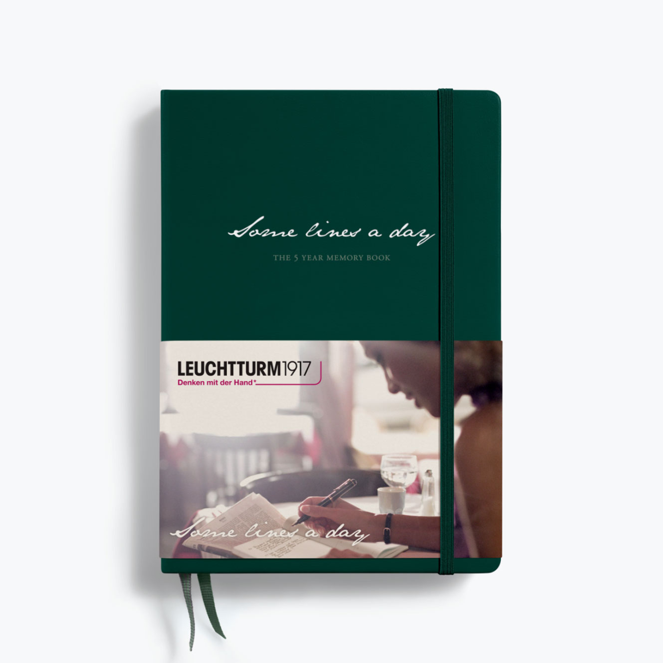 The A5 Forest Green Leuchtturm1917 some lines a day is a memory book with each page providing space to write a few lines every day over five years. Only the first two digits of the year (20_ _) are printed so you can start writing whenever you like.