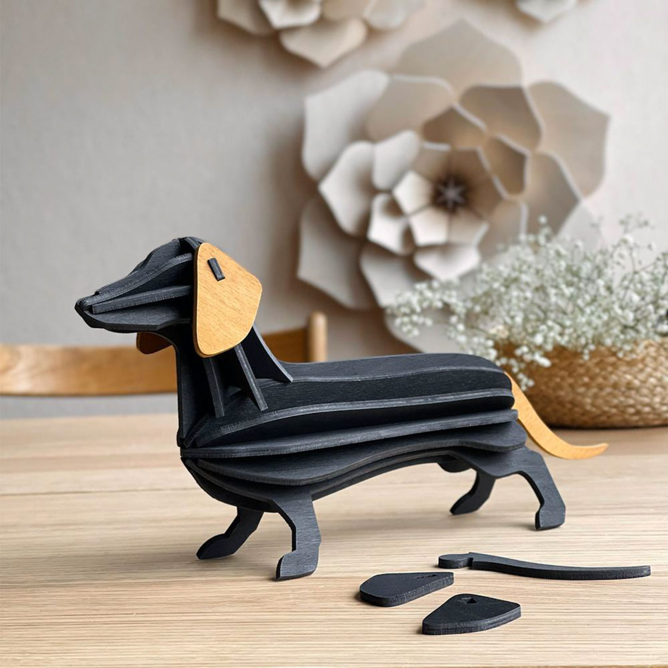 The dachshund comes in a flat, postcard-like package that is plastic-free and easy to send as a gift. Assembly requires no glue or tools. Simply attach the body parts, add the head, and finish by placing the ears. Illustrated instructions are included inside the package.