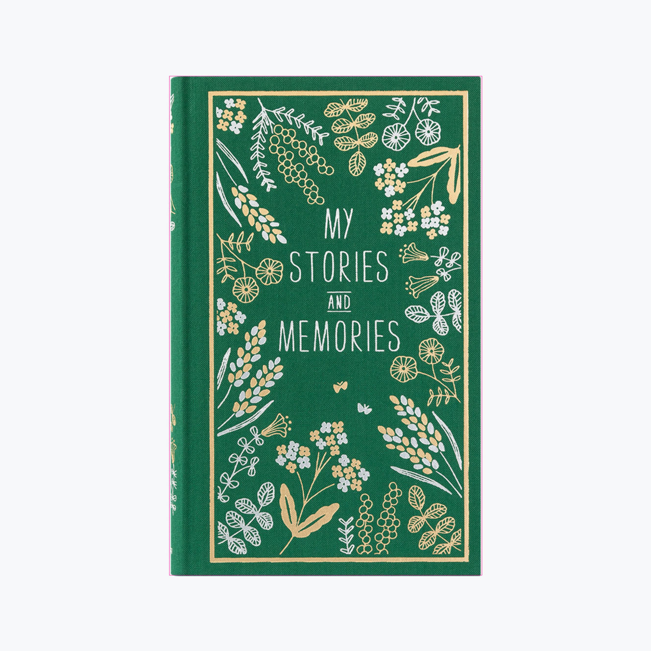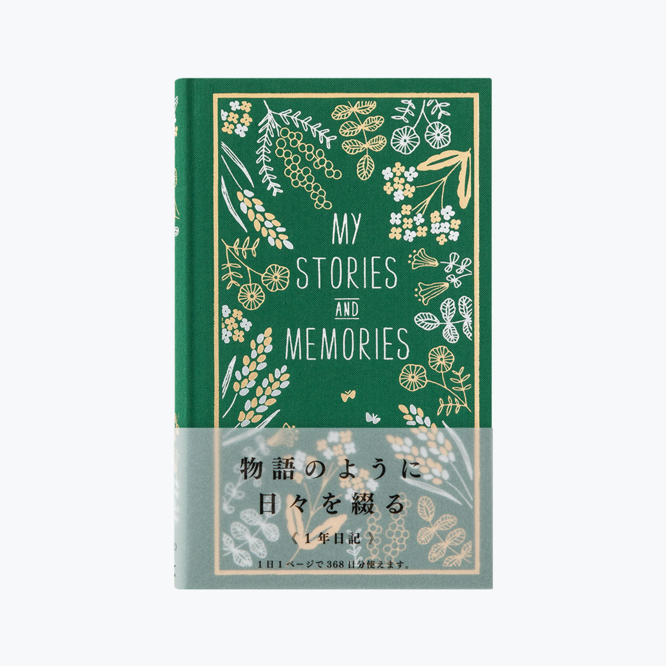Undated format allows flexible use; start any day and pause as needed. The green cover fabric features delicate floral illustrations; inside, simple lines designate date and daily space for writing.