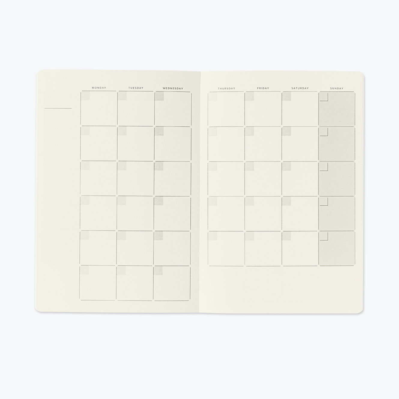 Midori Yuru Log B6 Free Diary Monthly offers undated monthly calendar spreads so you can start anytime. It’s made with sturdy MD Thick Paper that handles stamps and ink well, with a durable binding that lays flat. The compact B6 size is easy to carry around.