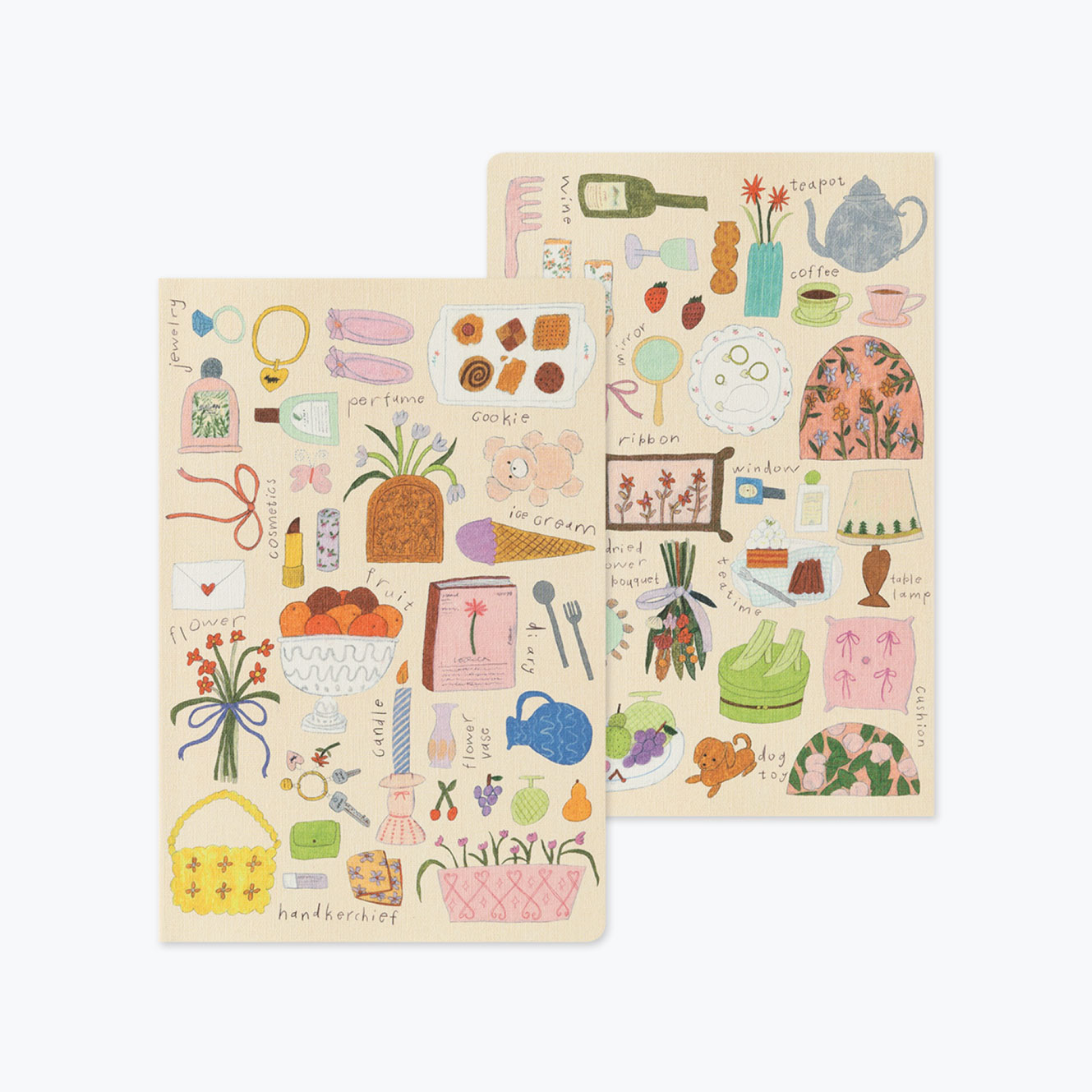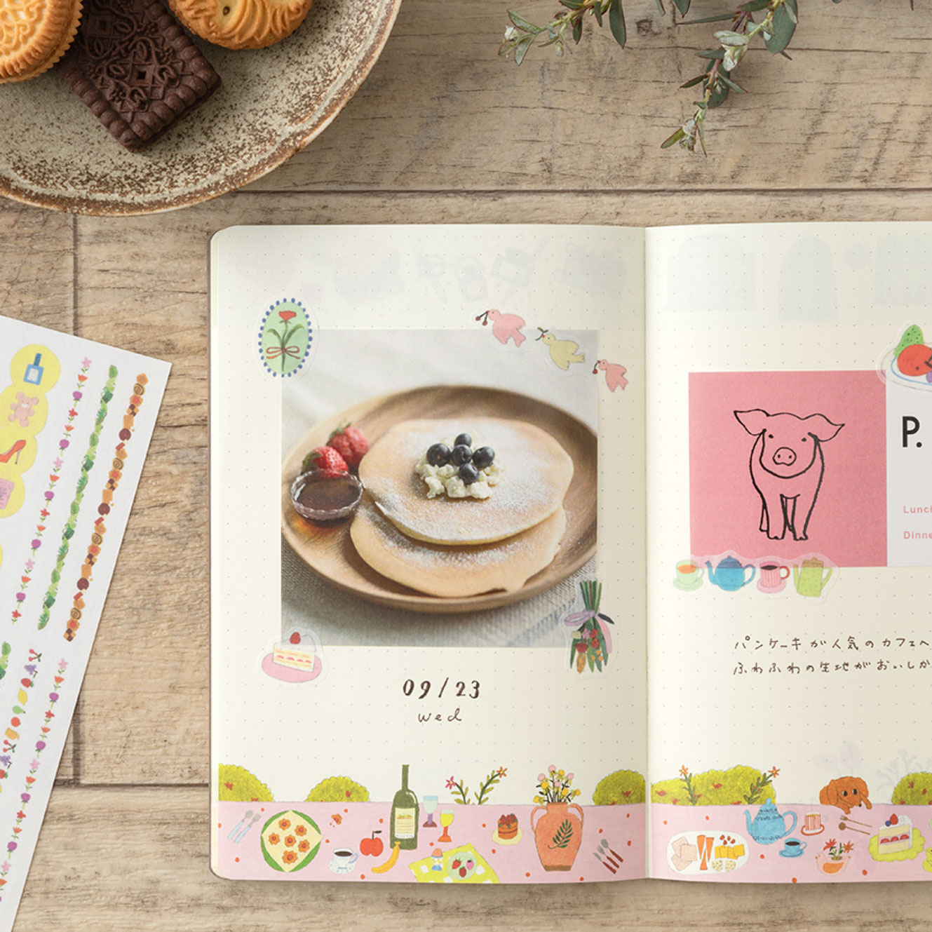 Midori Yuru Log B6 Life showcases charming everyday life illustrations like tea parties and plants. It uses MD Cream Paper for smooth writing and a binding that lies flat. The B6 size keeps it portable for capturing daily moments.