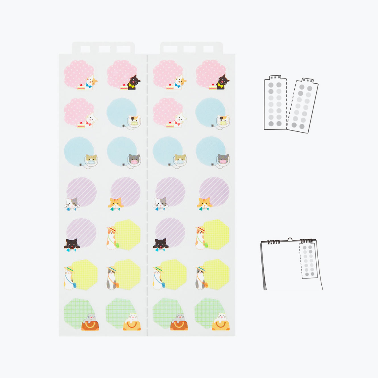 Each 8.4 × 13.4 cm sheet contains 28 non-removable (cannot be unpeeled and re-stuck) plastic stickers and is perforated in the middle, allowing it to be split into two slim 4.2 × 13.4 cm strips.