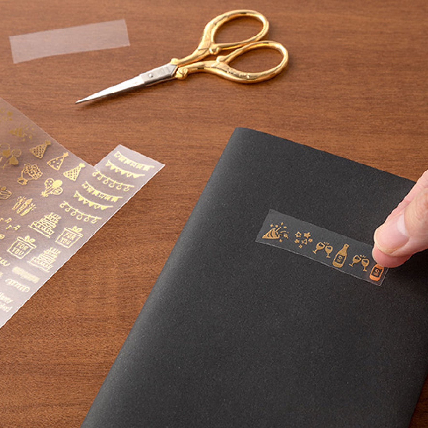 Bring your notebook, journal or even envelopes to life with the Midori foil transfer stickers featuring the celebration motif. The foil transfers can be used on paper or the cover of a notebook, with the gold foil adding a touch of sparkle to a lighter background or striking contrast to a dark background. The sticker itself is very thin and uses foil, creating a natural finish that looks like it was embossed onto the surface.