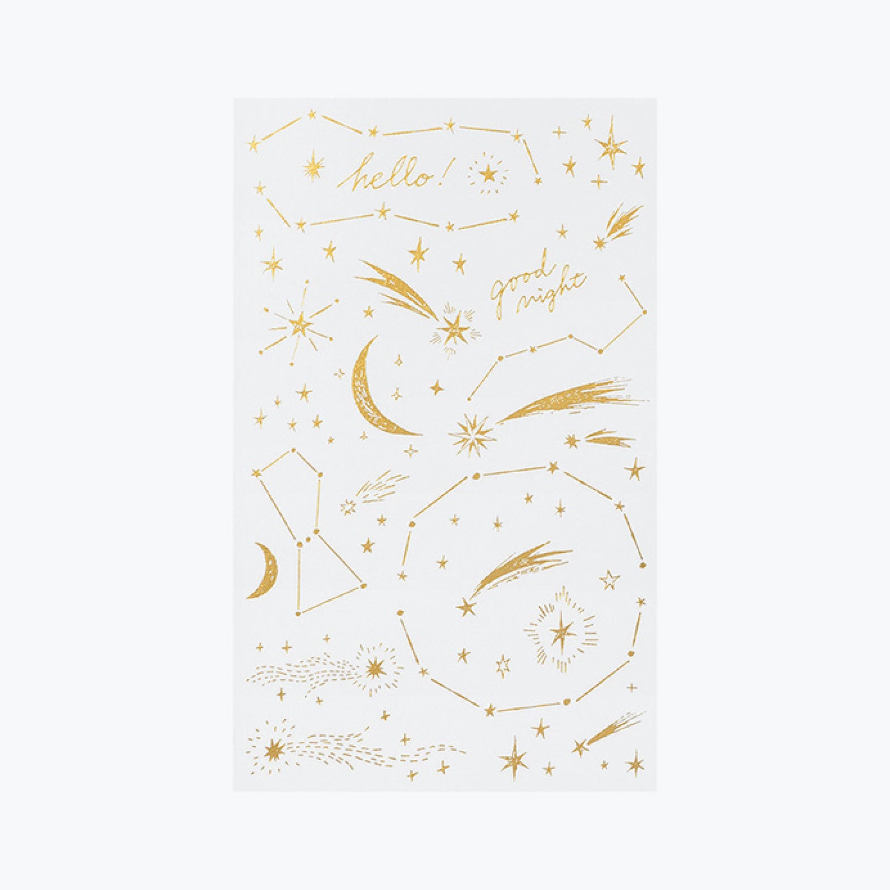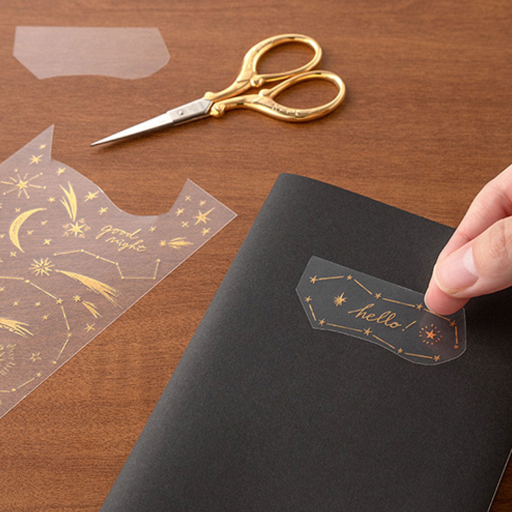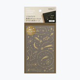 Bring your notebook, journal or even envelopes to life with the Midori foil transfer stickers featuring the galaxy motif. The foil transfers can be used on paper or the cover of a notebook, with the gold foil adding a touch of sparkle to a lighter background or striking contrast to a dark background. The sticker itself is very thin and uses foil, creating a natural finish that looks like it was embossed onto the surface.