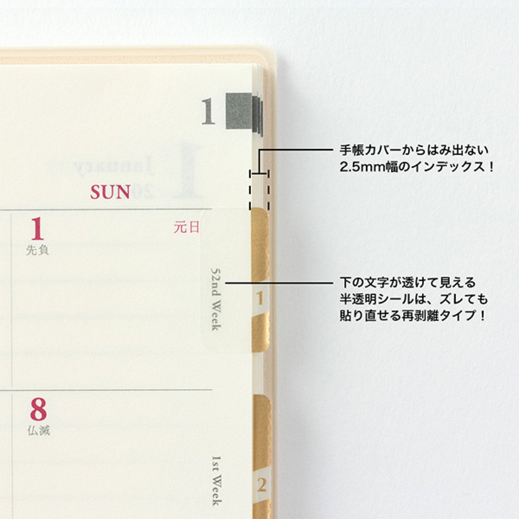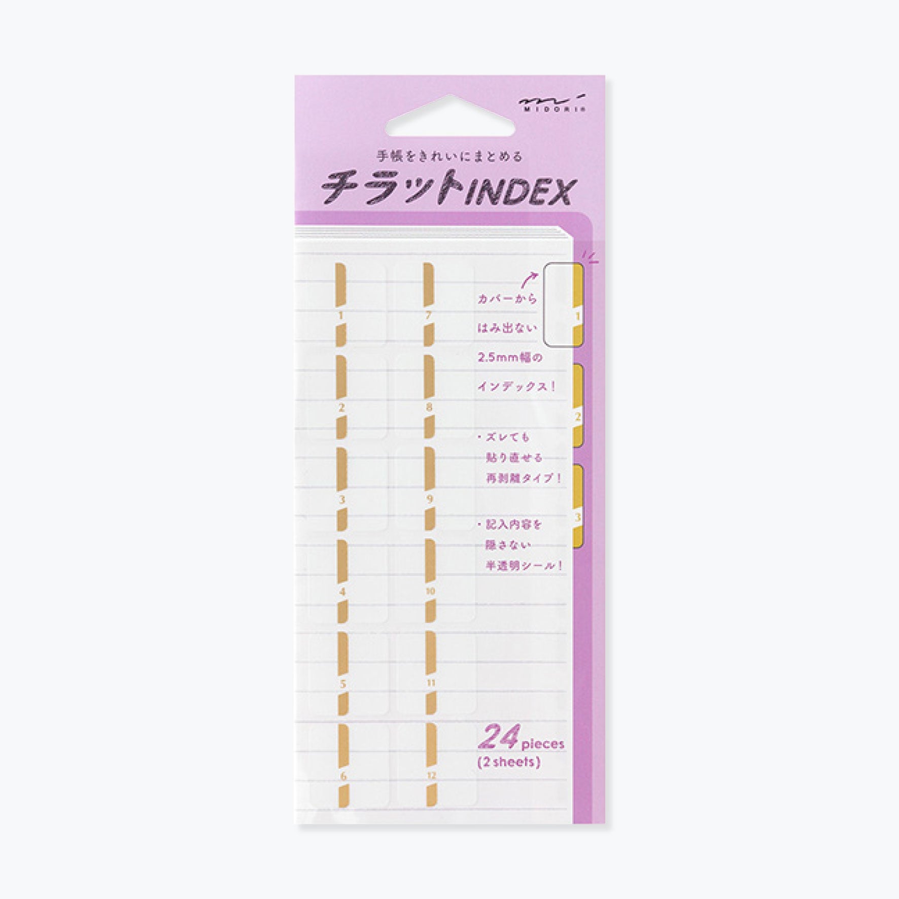 Midori’s Index Label (Chiratto) planner stickers feature ultra-thin, translucent PET tabs with easy-to-reposition adhesive. Each set includes two sheets of 24 labels (48 tabs total), protruding about ~2.5 mm for neat indexing without damaging pages. They’re durable, subtle, and they let underlying text show through. Perfect for organising journals, planners, or notebooks.