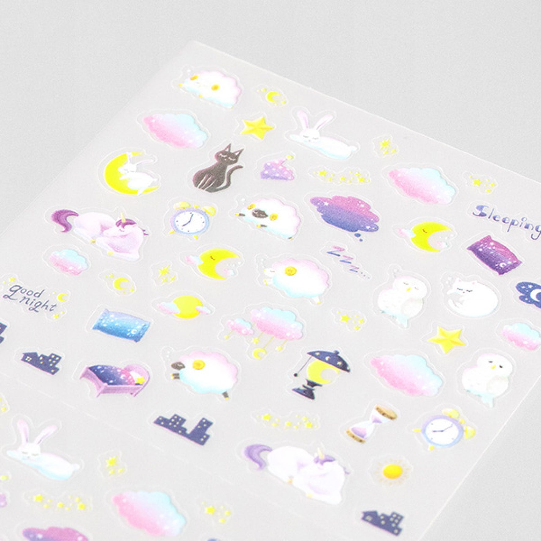 This sheet features cosy nighttime scenes with sleepy animals, moons, stars and dreamy nocturnal vignettes for bedtime journaling.