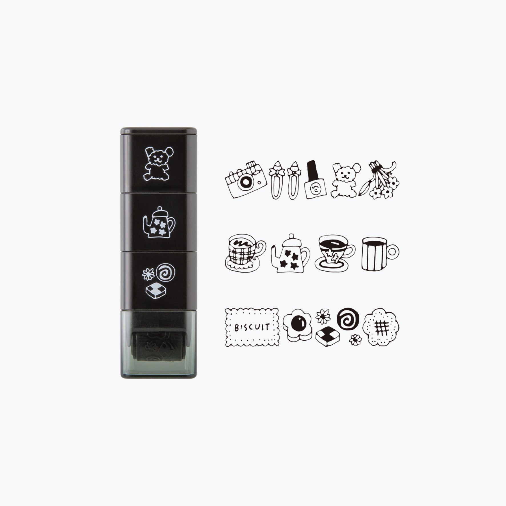 Using oil‑based pigment ink (which won’t smudge when coloured over with water‑based markers), each stamp can print up to roughly 40 meters before needing a refill. They detach and stack neatly together.
