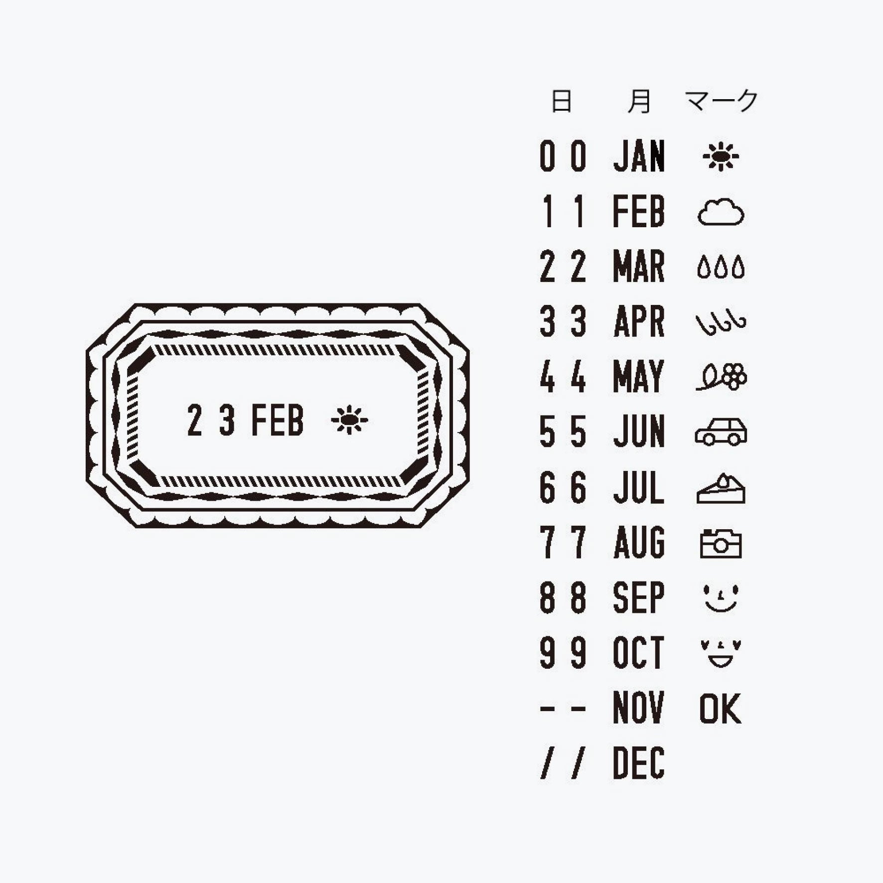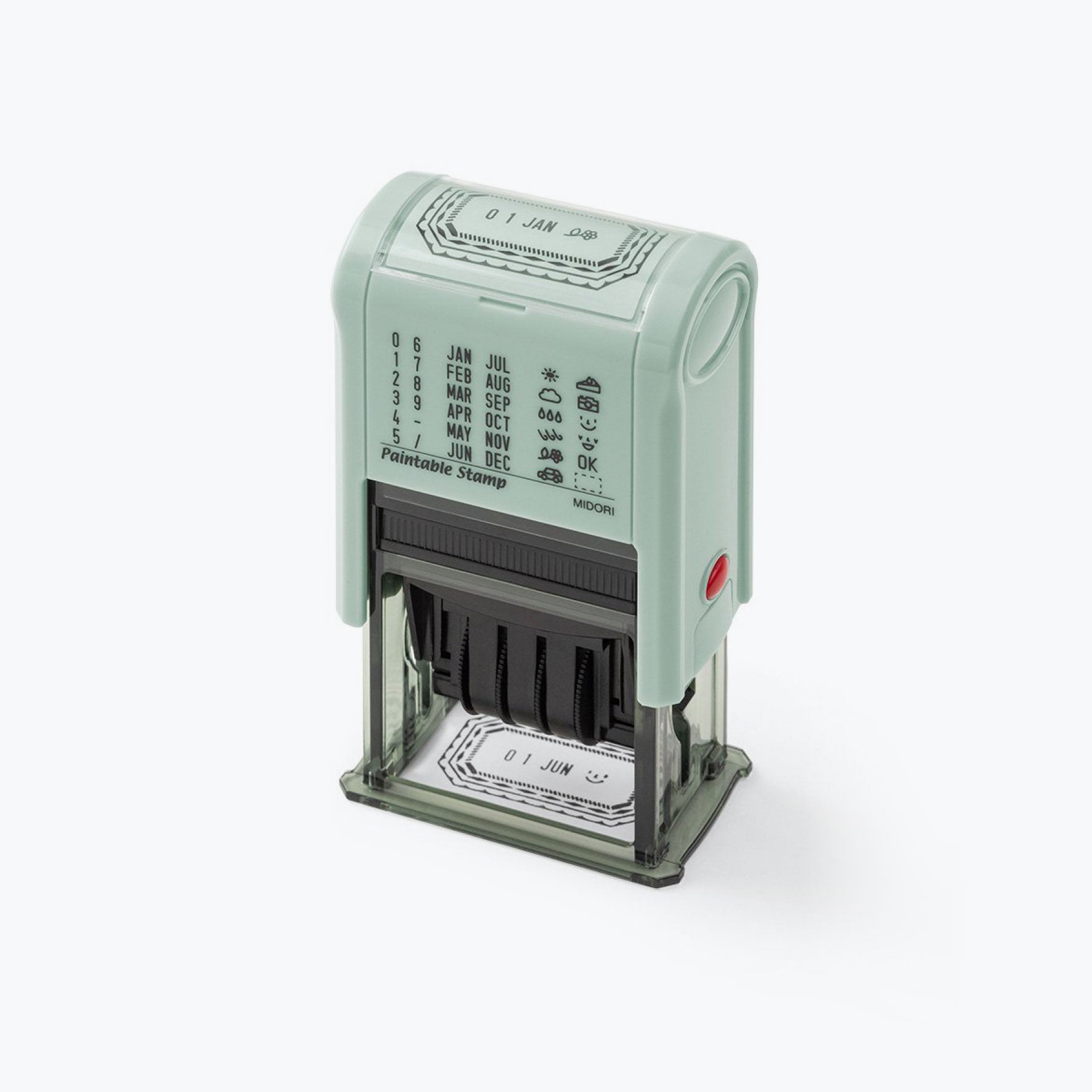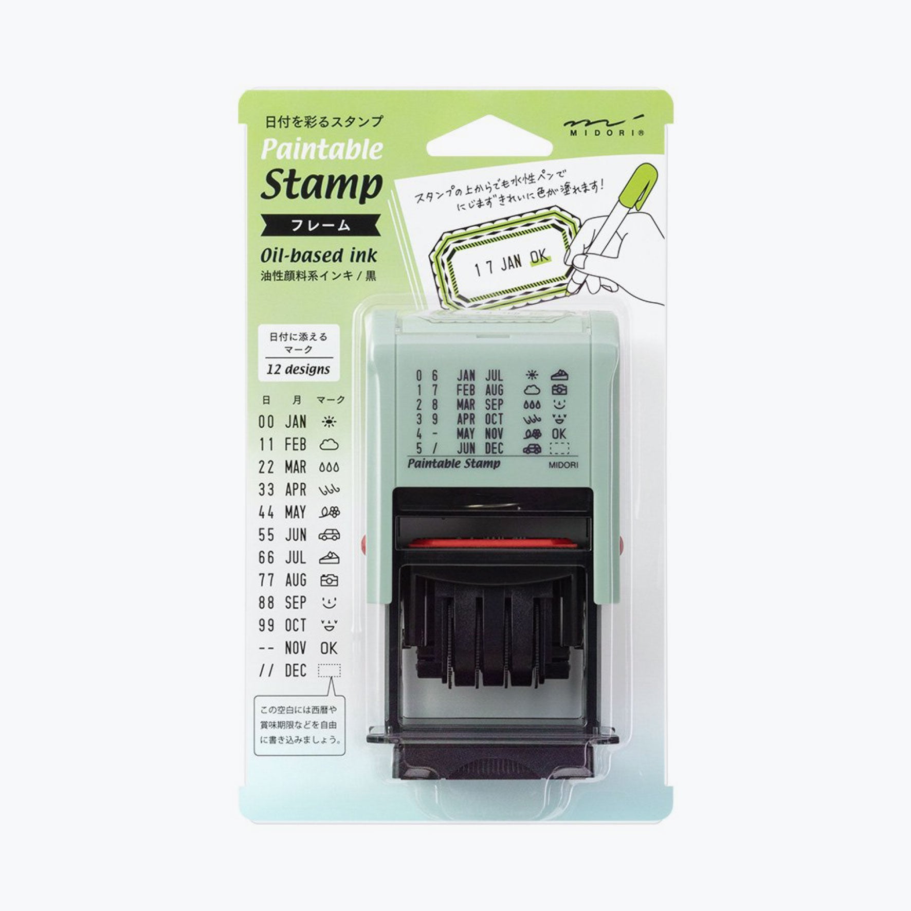 The Midori rotating date stamp is perfect for keeping your journal on track, birthday cards or even for expiry date labels. This design features a line frame as the border, which can be coloured in using the paintable brush pens as the oil-based, black ink is waterproof.