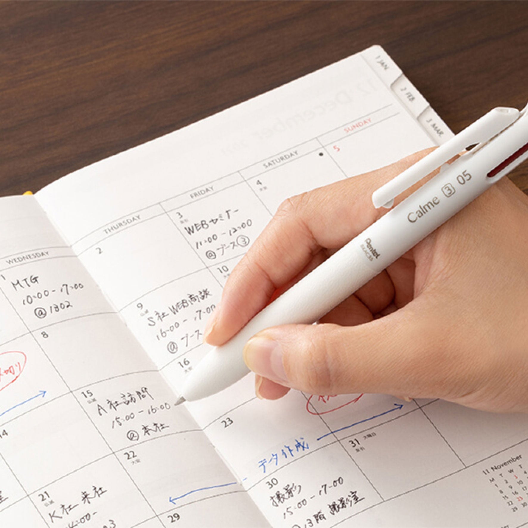 The Pentel Calme is designed to make writing comfortable and distraction-free with its innovative retracting mechanism that reduces click noise by 66% compared to other clickable pens. This multi pen version comes with three colours - black, blue and red - and uses Pentel's Vicuna ink, an oil-based, low-viscosity ink that flows beautifully and boldly onto paper.