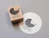 Material: varnished beech with motif sticker, the rubber stamp is mounted on a cushioning layer of foam.