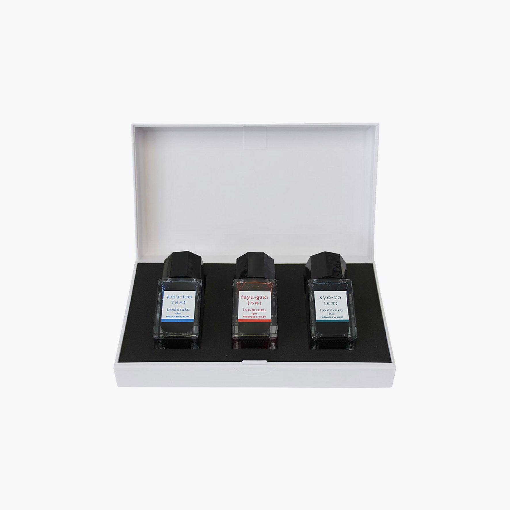 Iroshizuku is a dye based ink and this gift set features 3 x 15mL mini bottles - Sky Blue (Ama-iro), Winter Persimmon (Fuyu-syogun) and Dew on Pine Tree (Syo-ro).