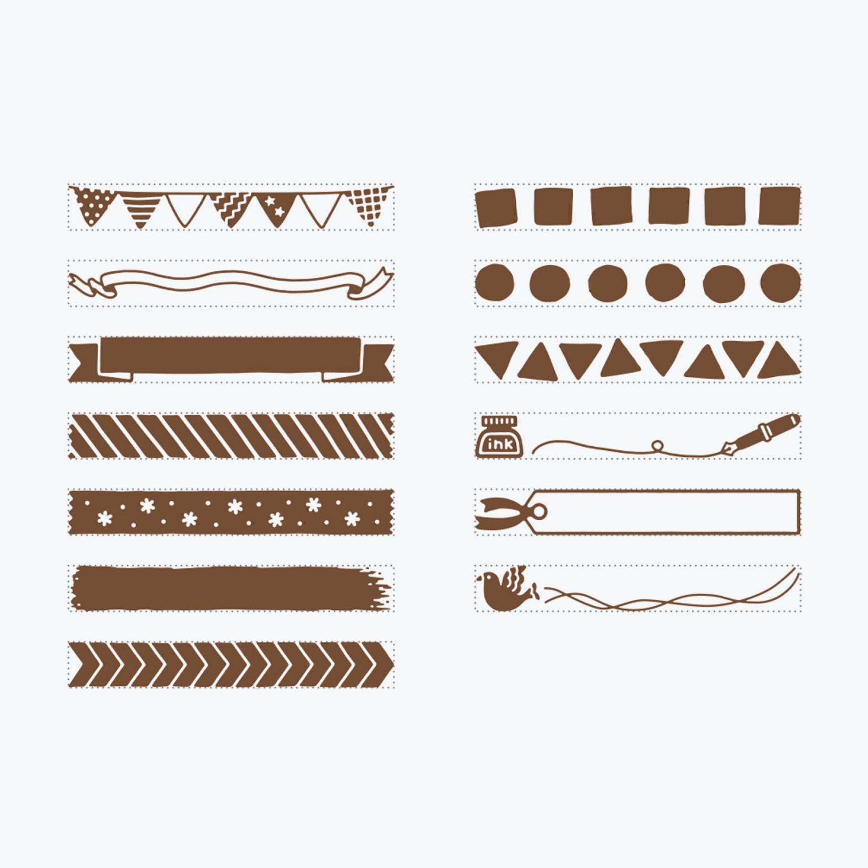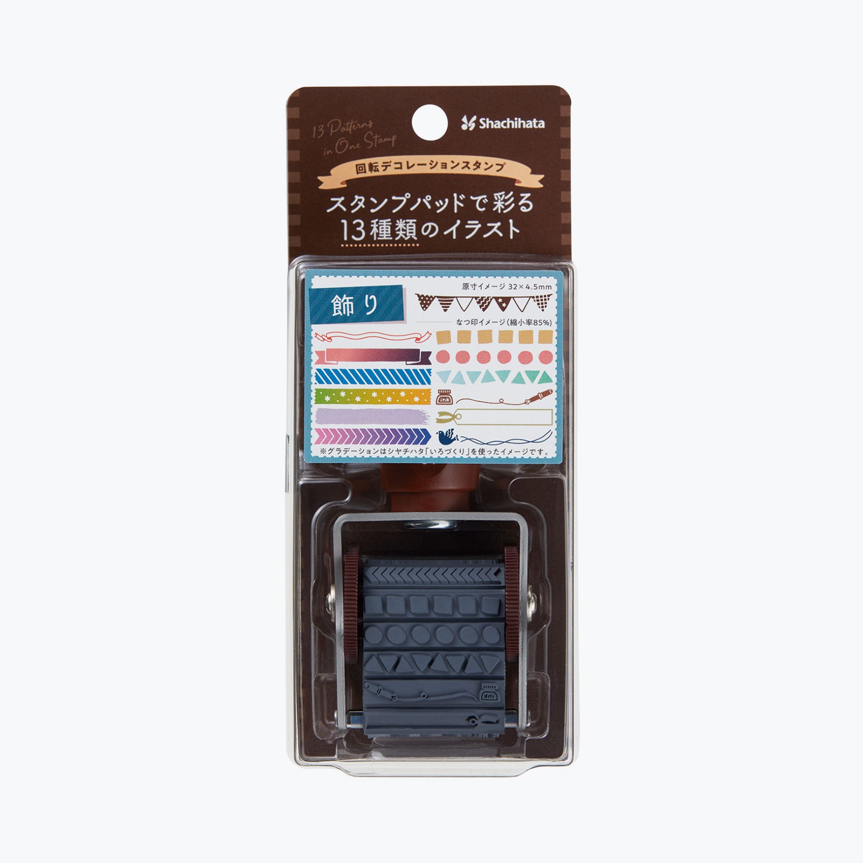 Add fun designs and borders to your planner or notebook with this rotating Shachihata rubber stamp. There are 13 decorative designs, which you can switch between by rotating the ridged wheels on each side. Each design is approximately 32mm long and 4.5mm tall.