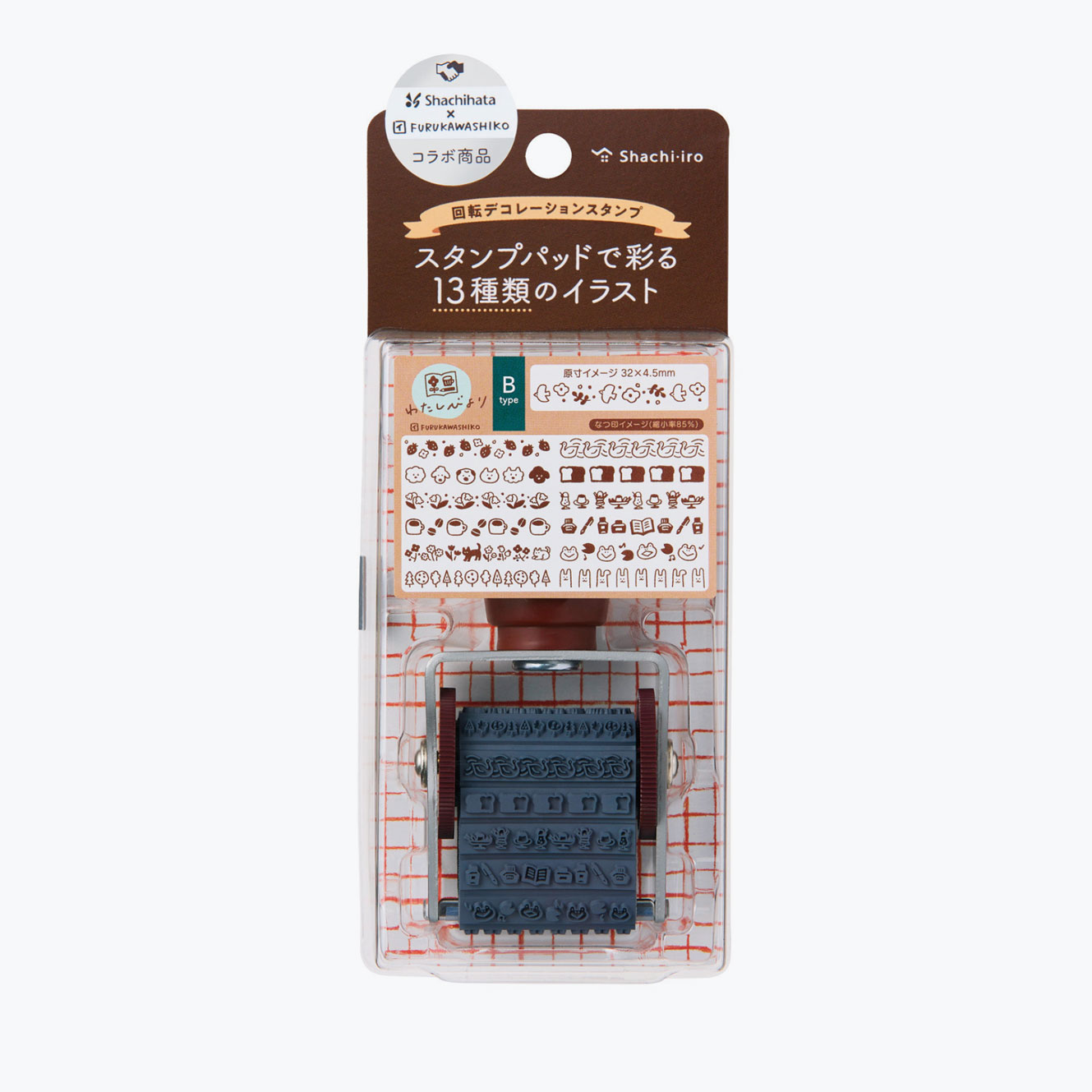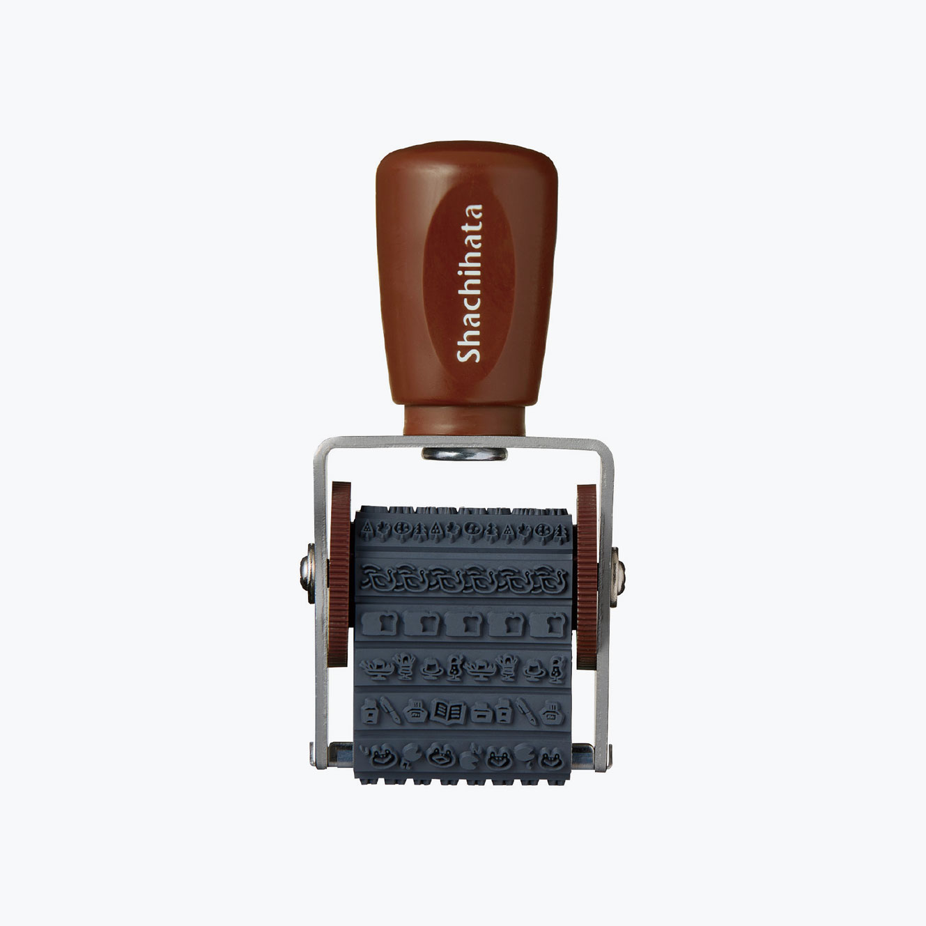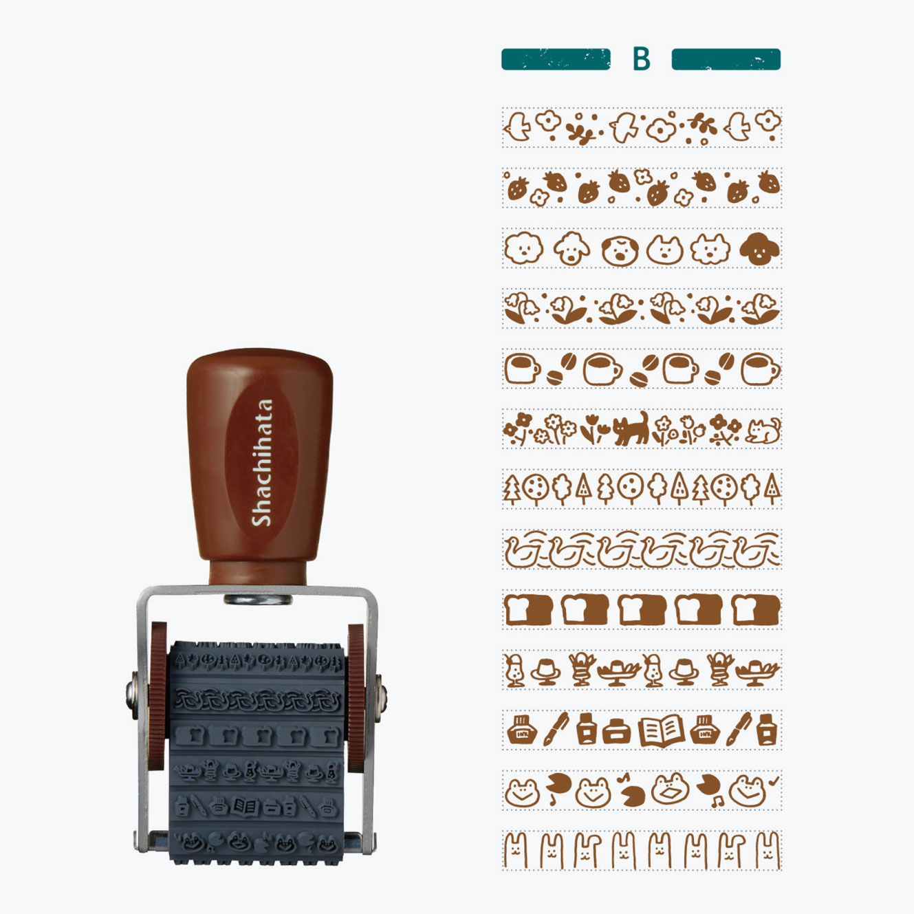 Add fun designs and borders to your planner or notebook with this rotating Shachihata rubber stamp. There are 13 Furukawashiko B designs, which you can switch between by rotating the ridged wheels on each side. Each design is approximately 32mm long and 4.5mm tall.