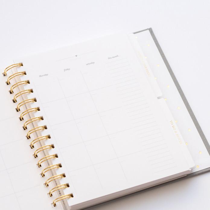 Includes a calendar grid, customizable tabs, guest address pages, gift journal, note pages, and a catch-all pocket.