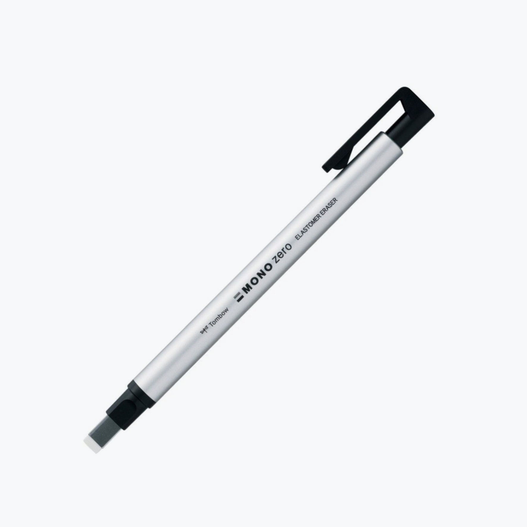 The silver Tombow Mono Zero is a high-precision eraser pen for pinpoint erasing. The ultrafine 2.5mm x 5mm rectangle eraser allows for correcting a single letter or detailed drawing