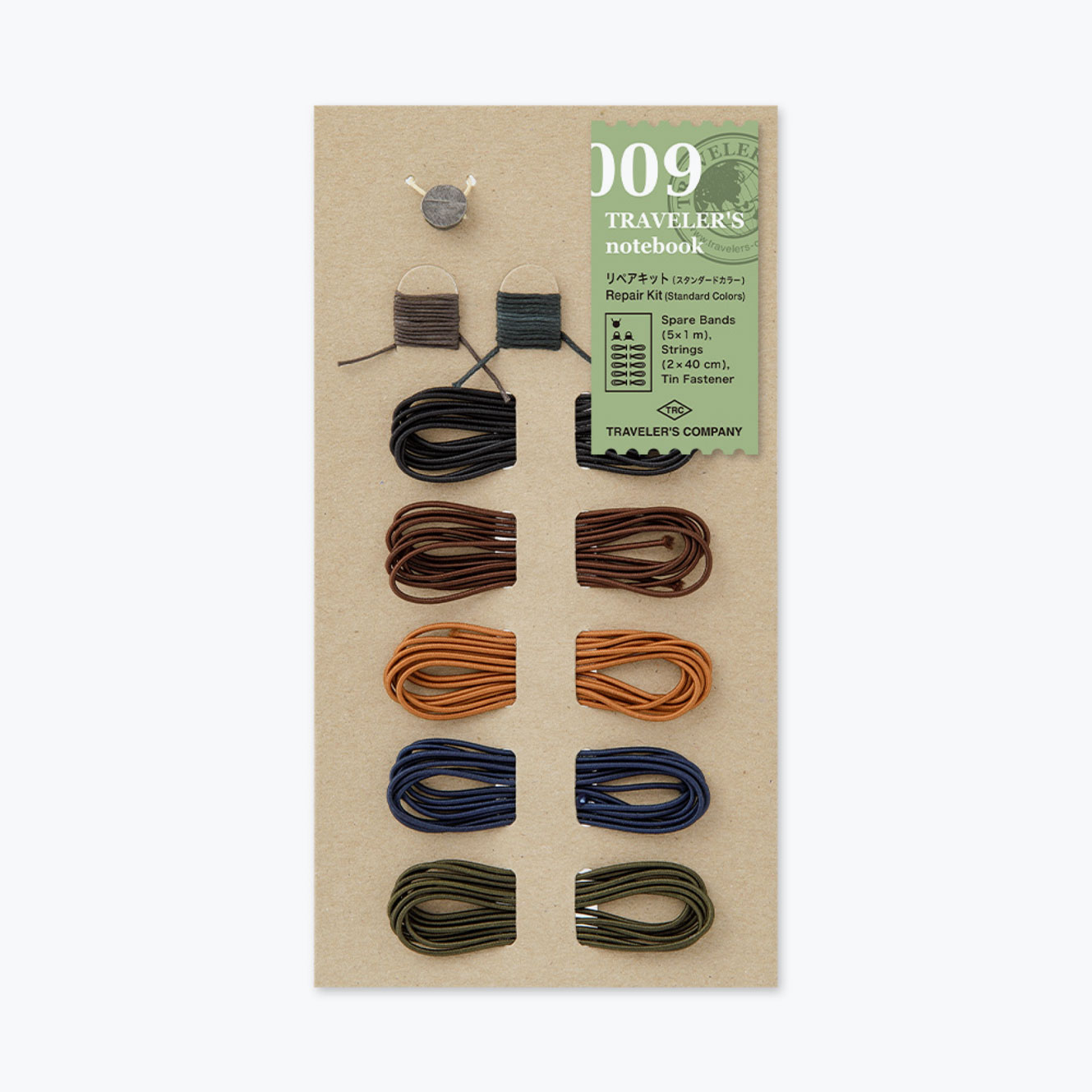 The 009 repair kit is used for customising or repairing the Traveler's Notebook. The kit contains: