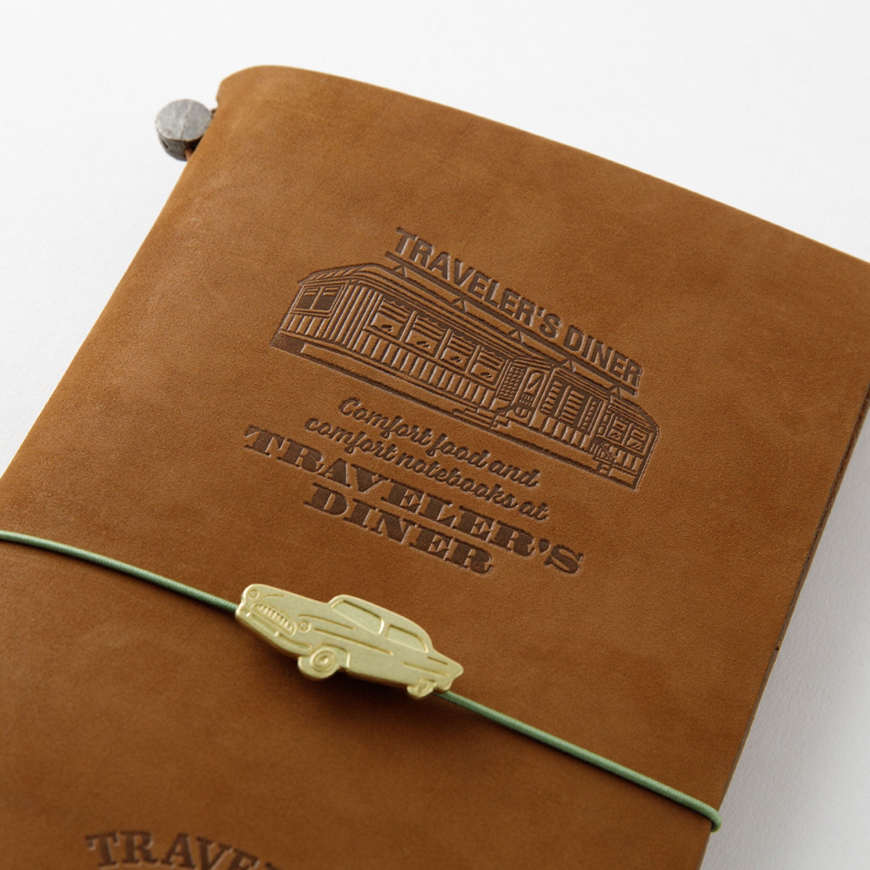 Enjoy the journey of your imagination with this limited design Traveler’s Notebook Diner set. The camel, regular size Traveler’s notebook is blind-debossed with the logo of the Traveler’s Diner, while the cover of the blank refill is inspired by a diner menu. The set also includes a brass, car charm that can be attached to the elastic of the notebook, stickers and stamps for customising the notebook, and a cotton bag that can be used as a storage pouch.