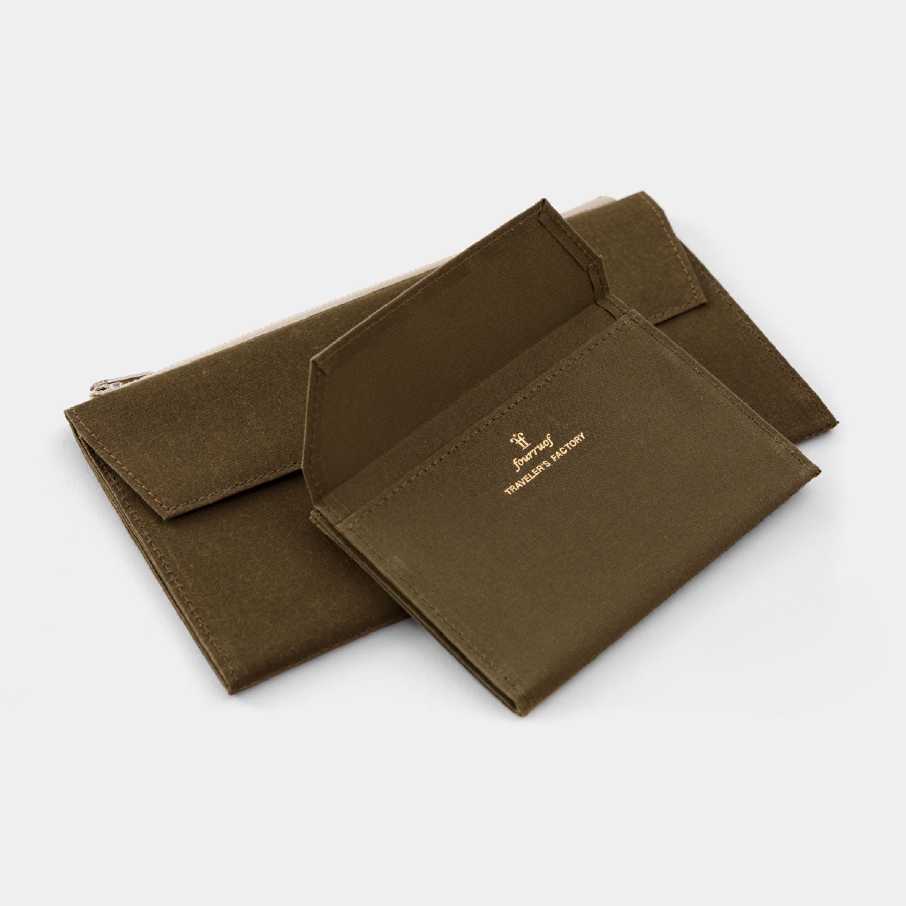 This regular sized, olive case has a zipper pocket that is perfect for storing money, keys or writing instruments, an envelope-style slip for carrying tickets and postcards and three small pockets for cards.
