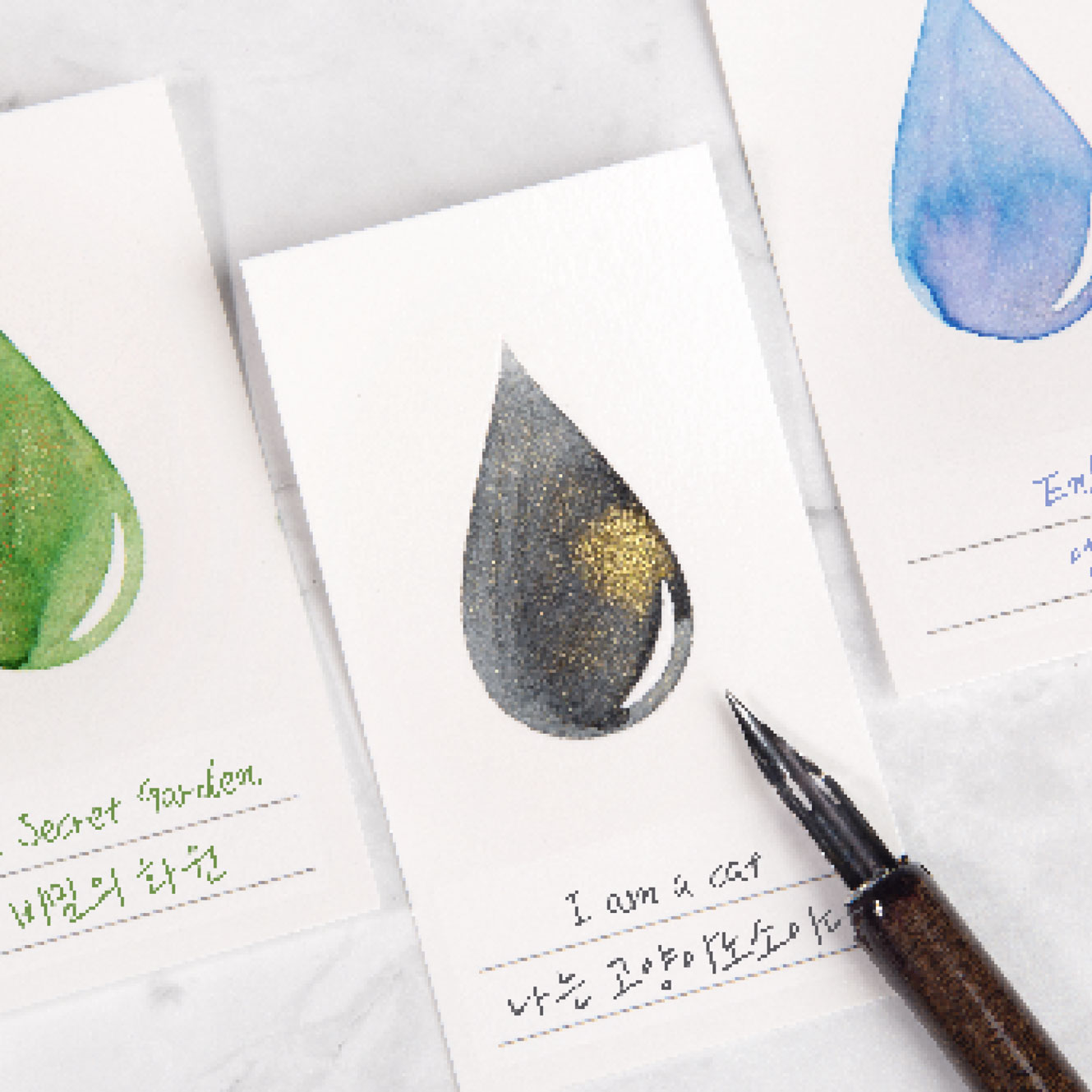 The Wearingeul Ink Drop swatch cards are made from 200gsm Impression paper, which is perfect for showcasing various ink characteristics including shading and sheening. When swatched, an ink drop appears. Pack of 50 swatch cards.